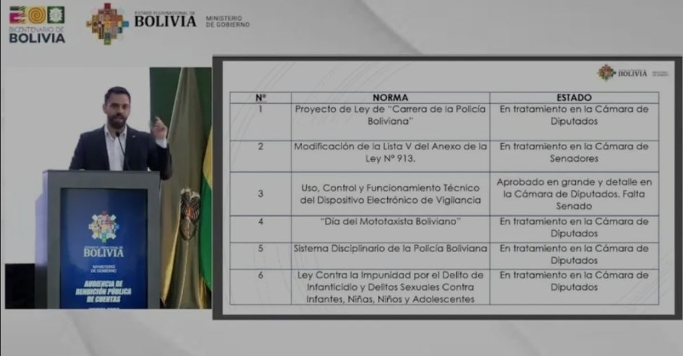 Los otros proyectos paralizados son el de la carrera de la Policía Boliviana (postergado por más de dos años); el de uso, control y funcionamiento técnico del dispositivo electrónico de vigilancia; el del sistema disciplinario de la Policía Boliviana; el del “Día del mototaxista boliviano” y el de lucha contra la impunidad por el delito de infanticidio y delitos sexuales contra infantes, niñas, niños y adolescentes