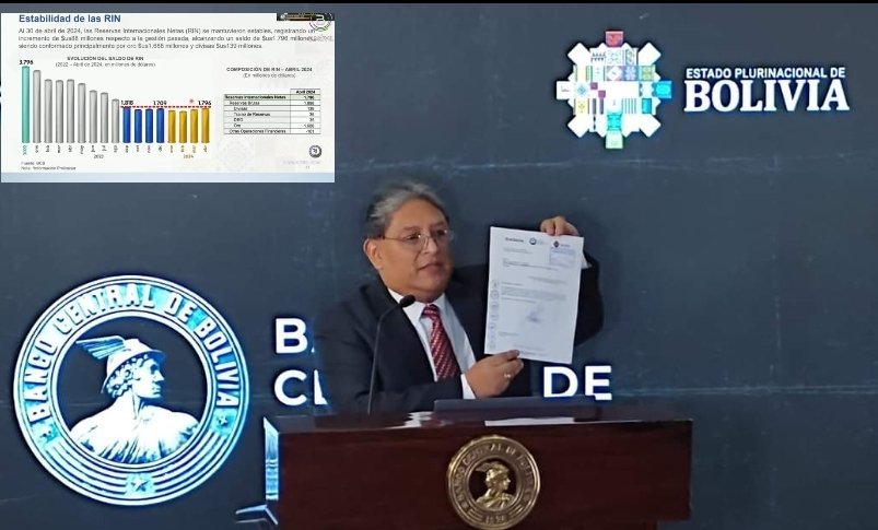 El Banco Central de Bolivia en conferencia de prensa brindo informe sobre las reservas internacionales netas al mes de abril de la presente gestión, reportando 1796 millones de dólares registrando un incremento de 88 millones de dólares respecto a la gestión pasada.