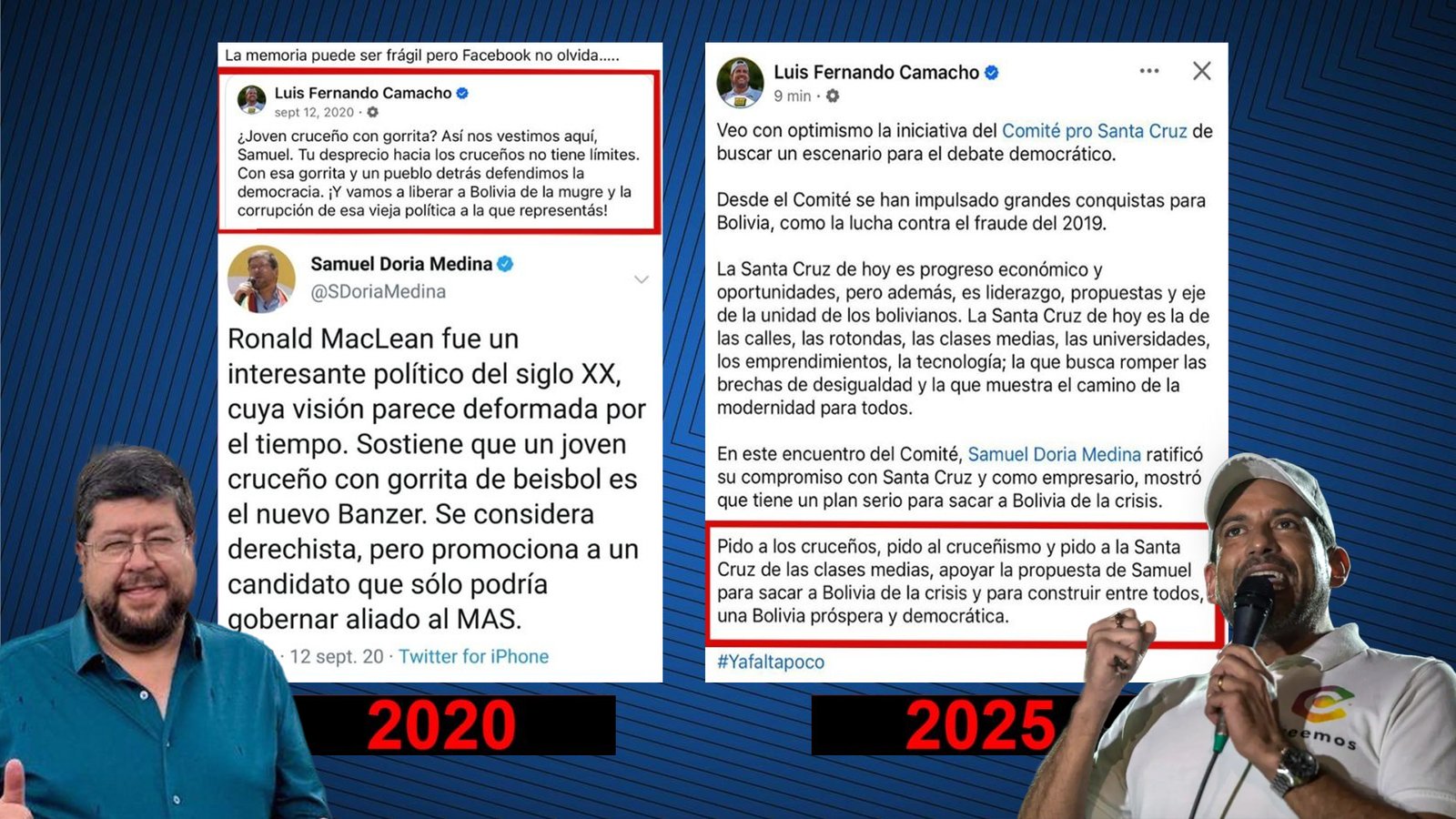 Un giro político inesperado ha reabierto el debate sobre las alianzas y contradicciones en el camino electoral rumbo a agosto. Luis Fernando Camacho, exlíder cívico y actual gobernador de Santa Cruz detenido en Chonchocoro, anunció su respaldo al empresario y candidato presidencial Samuel Doria Medina, a quien hace cinco años criticó duramente.