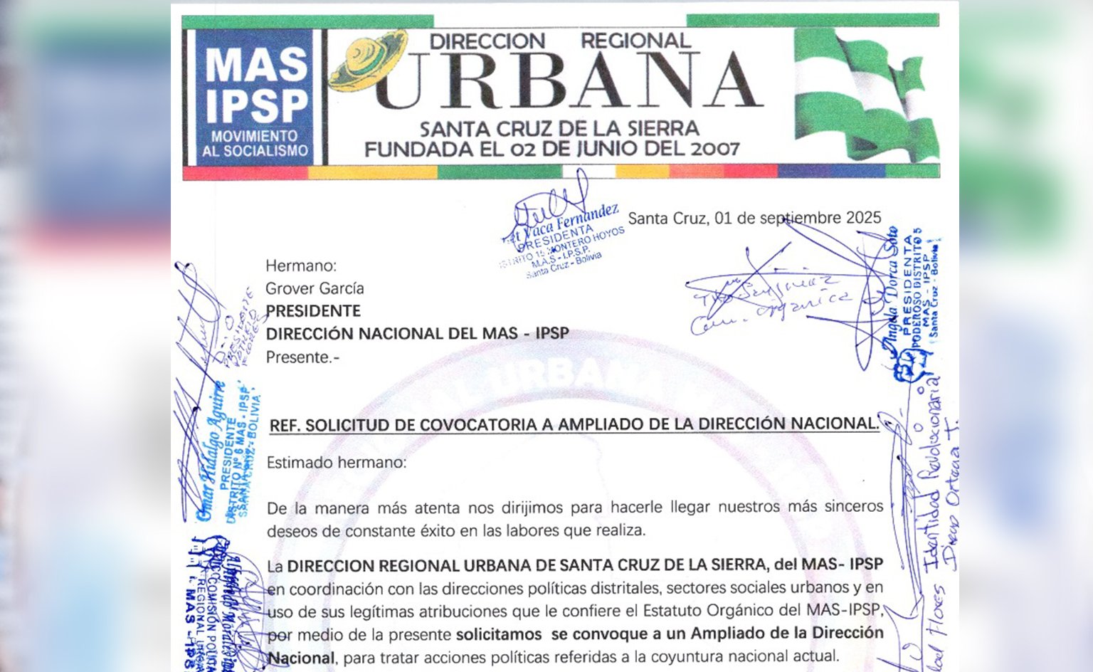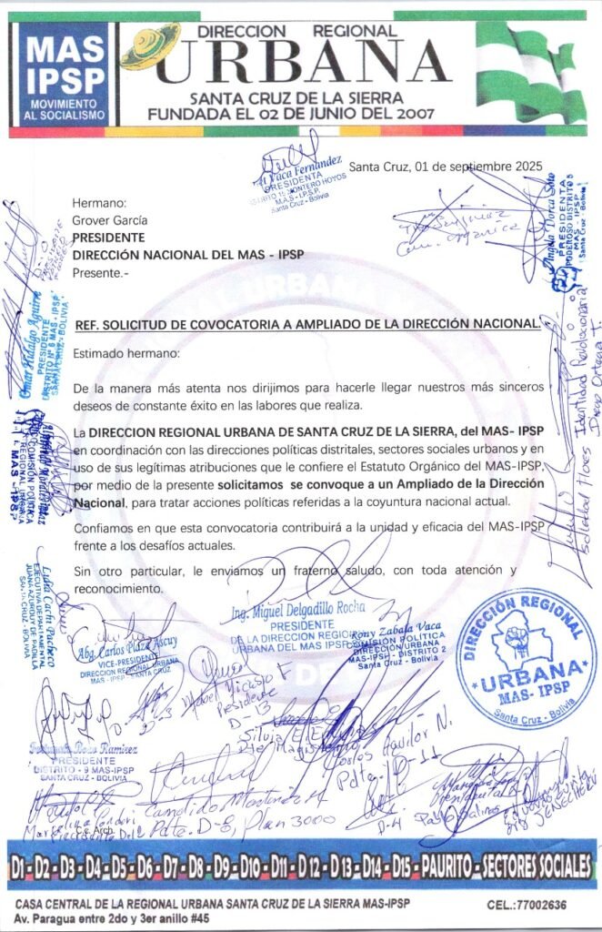 Santa Cruz de la Sierra, 2 de septiembre de 2025.- La dirección regional urbana del Movimiento al Socialismo – Instrumento Político por la Soberanía de los Pueblos (MAS – IPSP) en Santa Cruz de la Sierra envió una carta dirigida a Grover García, presidente de la dirección nacional del partido, solicitando la convocatoria a un ampliado de la dirección nacional.