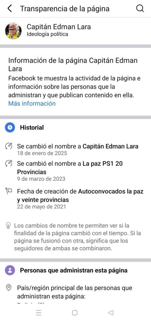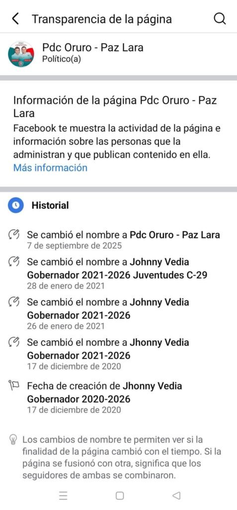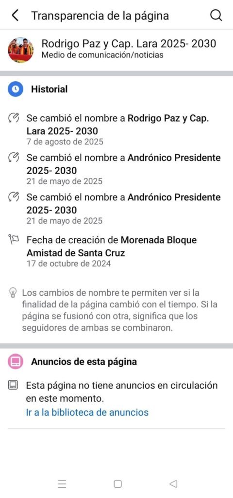 La Paz, 16 de septiembre de 2025.- En redes sociales circula una denuncia que señala que páginas de Facebook que antes manifestaban apoyo a figuras del Movimiento al Socialismo (MAS), entre ellos Andrónico Rodríguez, Luis Arce y Evo Morales, han cambiado de nombre para respaldar a los candidatos Edman Lara y Rodrigo Paz en las actuales elecciones nacionales.