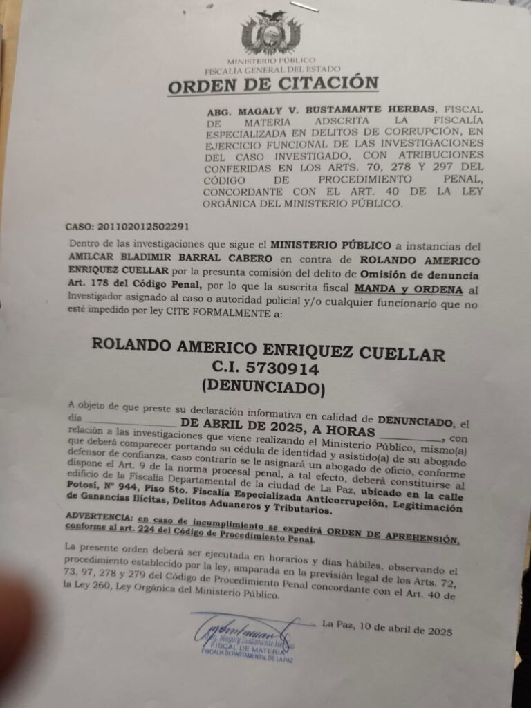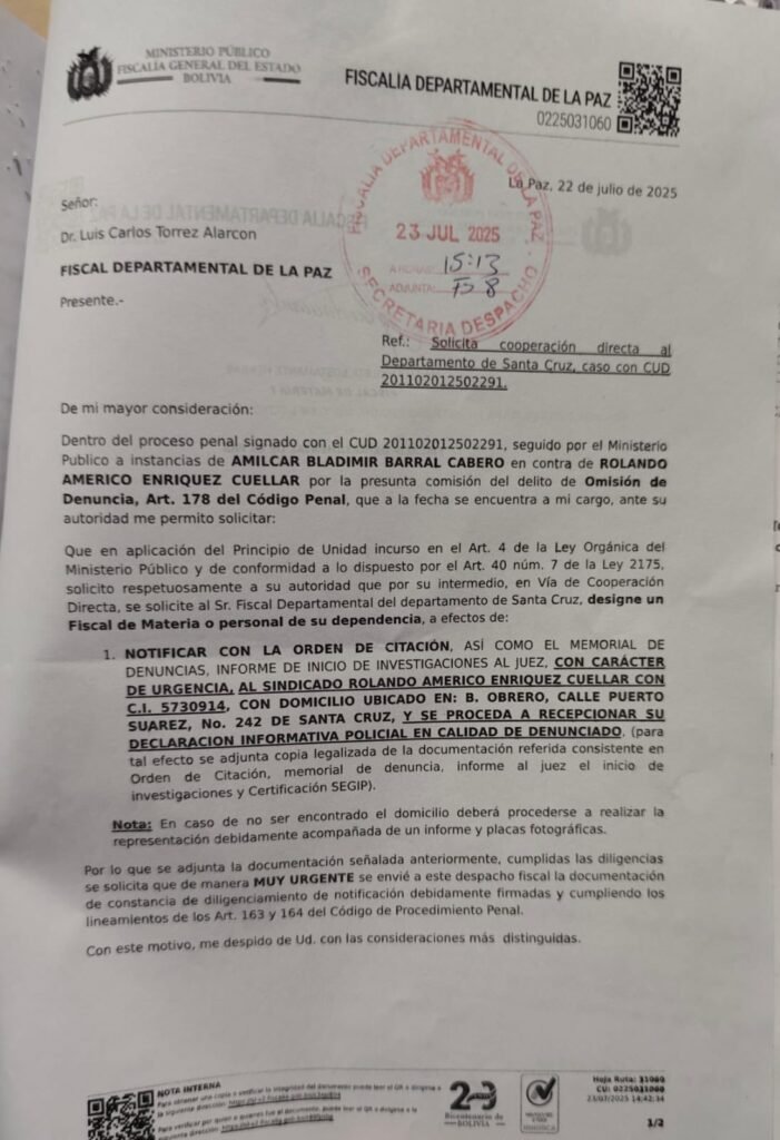 La Paz, 16 de septiembre de 2025.- El exdiputado Amílcar Barral solicitó formalmente a la Fiscalía la aprehensión del diputado Rolando Americo Enríquez Cuéllar por no presentarse a la convocatoria del Ministerio Público en el marco de una investigación por presunta omisión de denuncia en el caso de proxenetismo en la Asamblea Legislativa.