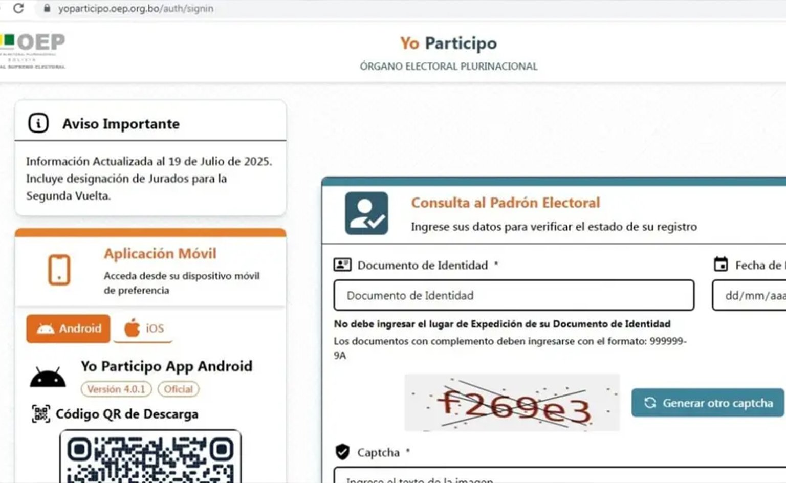 Para realizar la consulta, los ciudadanos deben ingresar a https://yoparticipo.oep.org.bo/, donde completarán con su número de cédula de identidad, fecha de nacimiento y un código de seguridad. La plataforma mostrará si fueron elegidos como jurados, además de detalles como mesa de sufragio, recinto, localidad, departamento y si pertenecen o no a algún partido político.