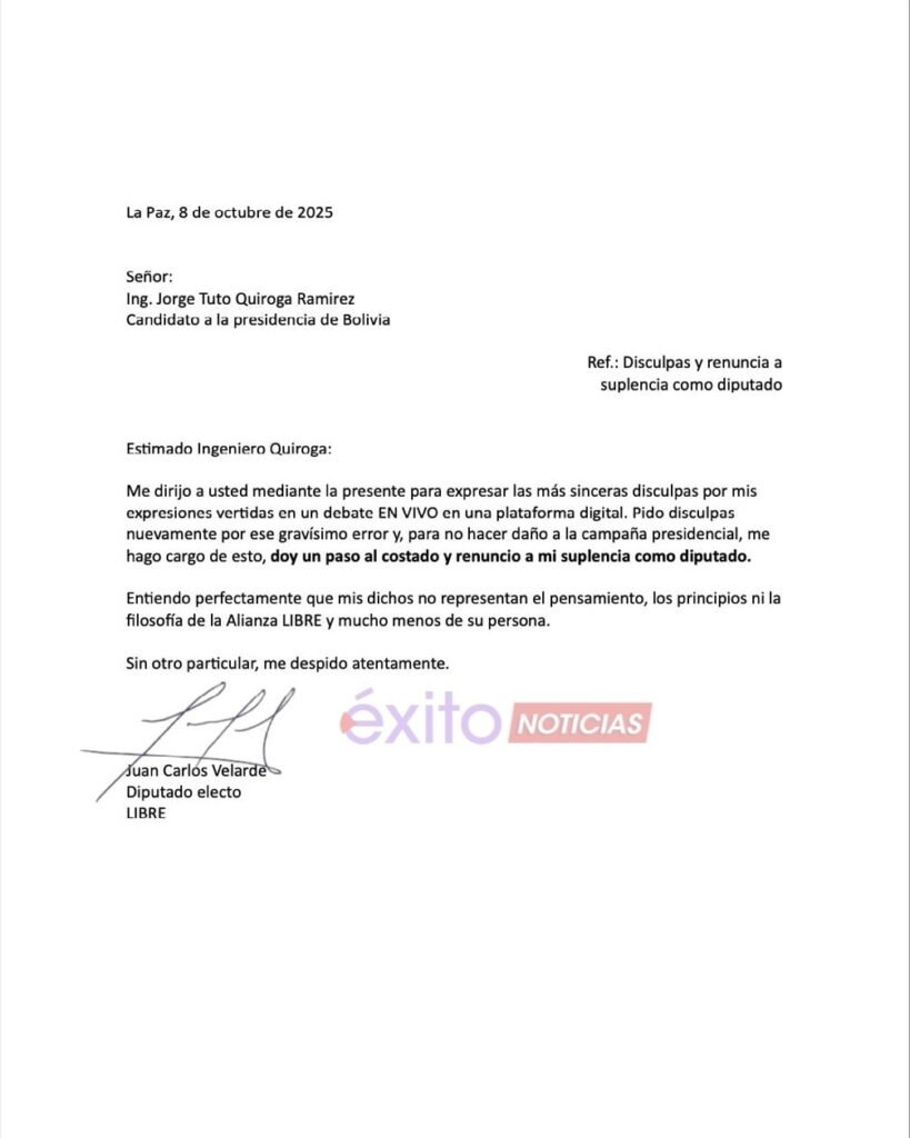 La Paz, 8 de octubre de 2025 – El diputado electo por la alianza Libre, Juan Carlos Velarde, presentó su renuncia formal al cargo y ofreció disculpas públicas tras hacerse virales sus declaraciones racistas emitidas en un foro digital en vivo. En una carta dirigida al candidato presidencial Jorge Tuto Quiroga, Velarde expresó “las más sinceras disculpas” por sus expresiones y anunció su decisión de “dar un paso al costado” para no perjudicar la campaña electoral.